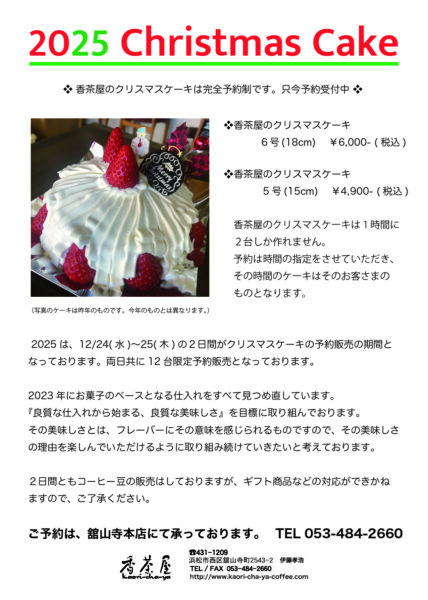 香茶屋のクリスマスケーキは、昨年同様に厳選素材でお作りするショートケーキのクリスマスバージョンです。